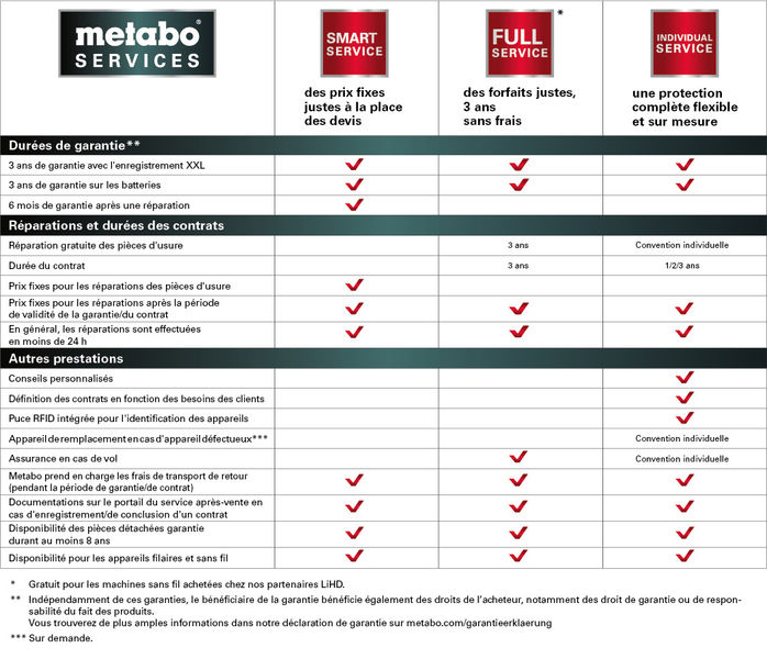 Que ce soit la garantie XXL extra-longue, l’upgrade FULL Service ou un contrat de service individuel, avec nos solutions de service Metabo, tu trouves toujours l’offre qui te convient. Tes machines Metabo sont ainsi parfaitement protégées et tu peux rapidement reprendre le travail en cas de réparation.