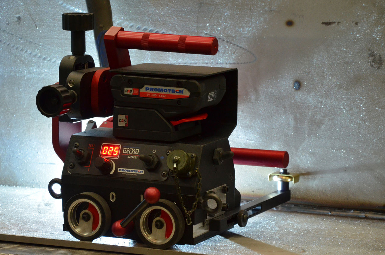 De beide accu-laswagens van Promotech – Mini Spider en Gecko Battery – zijn de juiste keuze als het om kwalitatief hoogwaardige lasnaden en het continu lassen met MIG/MAG-branders gaat. Beide laswagens zijn voorzien van vierwielaandrijving met magnetische tractie en een terugkoppelcircuit – het magneetsysteem houdt de laswagen in positie en het terugkoppelcircuit zorgt voor een gelijkmatige snelheid en een constante aanvoer van warmte, de vertraging reduceert en maakt een bijzonder nauwkeurige lastrupsgeometrie mogelijk. De beide laswagens verminderen het kostenverspillende overlassen en verminderen het verbruik van materiaal tot wel 60% – ze vallen bovendien op door hun snelheid, gebruikers gebruiken de machines veel minder lang dan bij het handlassen. De Mini Spider is zeer compact en licht – daarmee is hij ideaal voor werkzaamheden in kleine ruimtes en voor het lassen van rand tot rand, omdat de brander aan beide kanten van het apparaat kan worden aangebracht. De Gecko Battery daarentegen is meer geschikt voor rechtlijnige en onregelmatige oppervlakken tot een maximale radius van 1.000 mm. Hij wordt vaak in de aanhangerbouw, de bouw van olie- en watertanks in de scheepvaart en vele andere bereiken toegepast. Gebruikers kunnen de machine uitvoeren met verschillende geleidingsarmen en flexibele rails en daarmee koolstofstaal, roestvast staal en aluminium bewerken. Uitzonderlijk praktisch: de Gecko Battery kan twee branders aansturen. De beide nieuwe accu-laswagens zijn compact, licht en kunnen overal mee naartoe worden genomen.