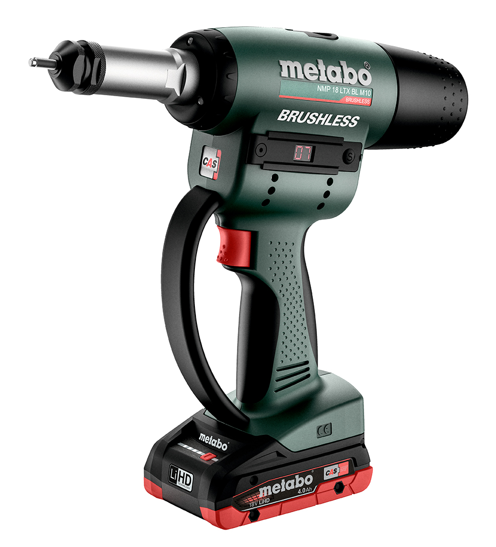 Met het accu-blindklinkmoerpistool van Metabo kunnen blindklinkmoeren van uiteenlopende materialen worden verwerkt – bij aluminium tot een diameter van 10 mm, in staal tot 8 en in roestvast staal tot een diameter van 6 mm. Met de bijpassende adapter (toebehoren) is bovendien een verwerking met blindklinkschroeven mogelijk. Ook voor de voorbereidende werkzaamheden rondom het aanbrengen en de bewerking achteraf heeft Metabo het juiste gereedschap in haar programma. „Om bijvoorbeeld eerst een gat te boren, is de accu-boorschroefmachine met 3 versnellingen BS 18 LTX-3 BL Q I een goede keuze, voor het vastschroeven kan men het beste de accu-slagschroevendraaier SSD 18 LTX 200 BL nemen“, aldus Stark. De NMP 18 LTX BL M10 is met zijn krachtige borstelloze motor onderdeel van het 18 Volt-systeem van Metabo en tevens een uitbreiding van het fabrikanten overkoepelend accu-systeem CAS (Cordless Alliance System). Binnen CAS zijn er op dit moment ca. 280 machines van 25 verschillende fabrikanten die uitwisselbaar zijn met één accu en naar believen met elkaar gecombineerd kunnen worden.