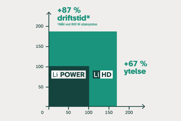LiHD-batterier setter nye målestokker for å kombinere ytelse med lang driftstid og bruksfleksibilitet. De sterke cellene i Metabo LiHD-batterier gir nok power til alle typer bruk og maskiner fra 400 til 1.500 Watt.