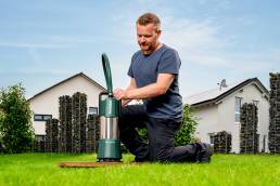 - Senketrykkpumpe med flottørbryter for hagevanning og forsyning av andre forbrukere fra dyptliggende kilder, som brønner eller sisterner