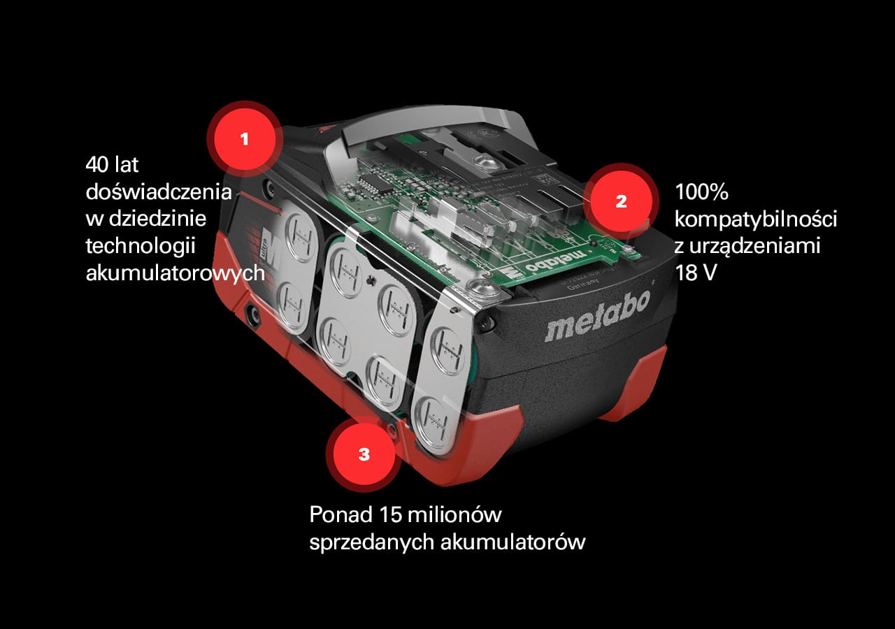 Metabo oferuje najwydajniejszą na świecie technologię akumulatorową, która jest w 100% kompatybilna z uniwersalnym standardem CAS wykorzystywanym przez czołowych producentów. Pozwala na zastosowania w zakresie od 400 do 3200 W i zapewnia wystarczającą moc do najbardziej energochłonnych zadań.